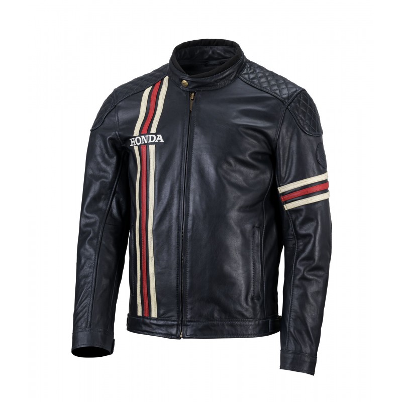 The timeless design features decorative red and beige stripes, along with the embroidered Honda logo on the chest, offering a vintage and authentic look. With built-in shoulder and elbow protection, this jacket also ensures your safety during your rides.
